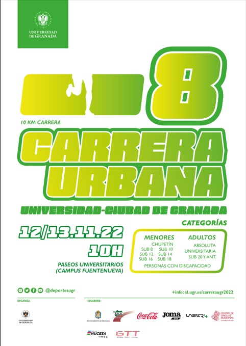 El Centro de Actividades Deportivas de la Universidad de Granada y la Concejalía de Deportes del Excmo. Ayuntamiento de Granada organizan, con la colaboración de otras empresas, la 8ª Carrera Universidad-Ciudad de Granada, carrera a pie de 10 kilómetros, en la que podrá participar cualquier persona que lo desee, federada o no, siempre y cuando esté correctamente inscrita tanto en tiempo como en forma, y acepte las condiciones y normativa establecidas por la Organización..CIERRE DE INSCRIPCIONES