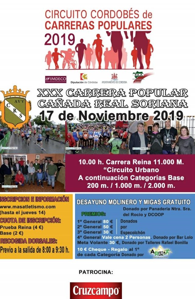 Prueba puntuable para el Circuito Cordobés de Carreras Populares. Desayuno molinero y migas para loss participantess y acompañantes.
