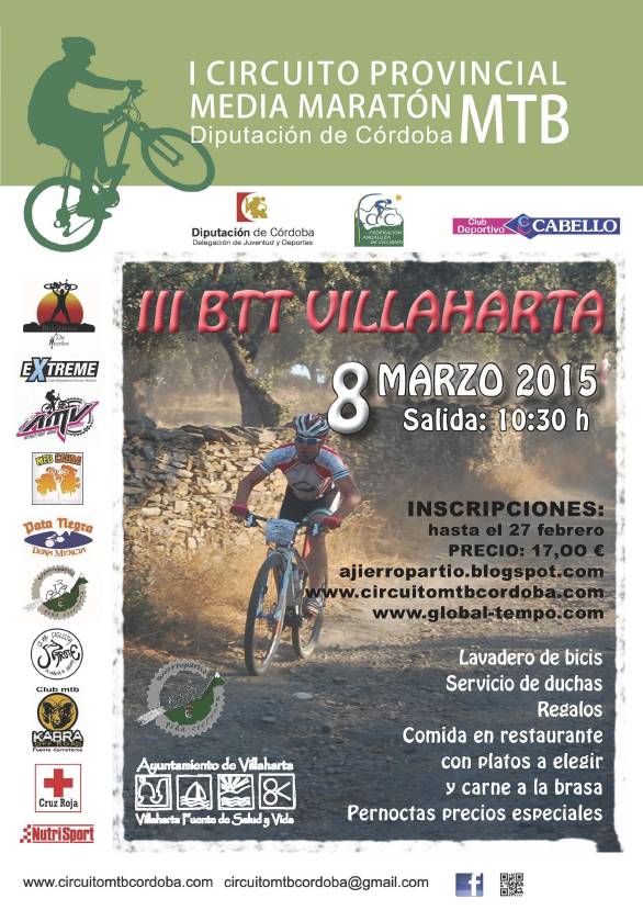 Villaharta, situada en pleno corazón de Sierra Morena, organizará el próximo 8 de marzo de 2015, la 6ª prueba puntuable del I Circuito Provincial de Media Maratón MTB Diputación de Córdoba. Prueba por plena sierra completamente de mountain bike, de un total de 47 km, y desnivel acumulado de 1.350 mtrs. El recorrido será bastante exigente físicamente con incesables subidas y bajadas, predominará las pequeñas veredas y senderos y en ellos los corredores tendrán que poner en prácticas sus habilidades técnicas. La carrera transitará por los siguientes puntos destacables: antiguo monasterio de Pedrique, por las conocidas Fuentes Agrias de Villaharta, el GR 48 y Camino Mozárabe de Santiago-Cañada Real Soriana.LIMITE 300 PARTICIPANTES Web Circuito Provincial MTB Diputación de Córdoba