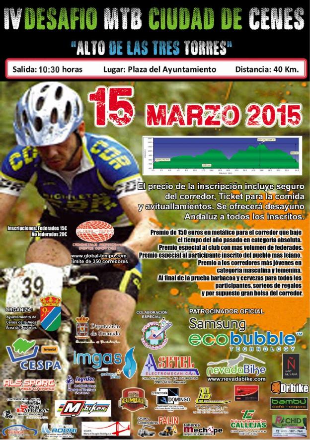 El Área de Deportes del Ayuntamiento de Cenes de la Vega (Granada) organiza el IV Desafío MTB Ciudad de Cenes "Alto de las Tres Torres", que se celebrará el próximo 15 de marzo de 2015.Ya tenemos de nuevo la cuarta edición del Alto de las Tres Torres, que este año será un espectáculo seguro ya que el recorrido se ha arreglado y es aun mas especial. Y por supuesto con mas regalos de los nuevos patrocinadores, sorteos de paletilla para todos y, como no, un buen desayuno antes de salir a pedalear y una barbacoa final para todos los participantes regado con un buen vino de Bodegas Muñana y cerveza para todos los participantes, ya que los protagonistas del evento sois los bikers. Ya sabéis, os esperamos en el IV Desafío.