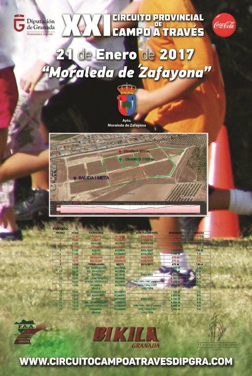 La Delegación de Deportes de la Diputación de Granada, en colaboración con los Ayuntamientos organizadores de Cuevas del Campo, Lecrín La Zubia y Moraleda de Zafayona, junto con la Delegación Granadina de la Federación Andaluza de Atletismo y con la colaboración de los alumnos en prácticas del Ciclo de Actividad Física del Instituto Hermenegildo Lanz promueven, con el patrocinio de Coca Cola, una nueva edición del Circuito de Campo a Través.
